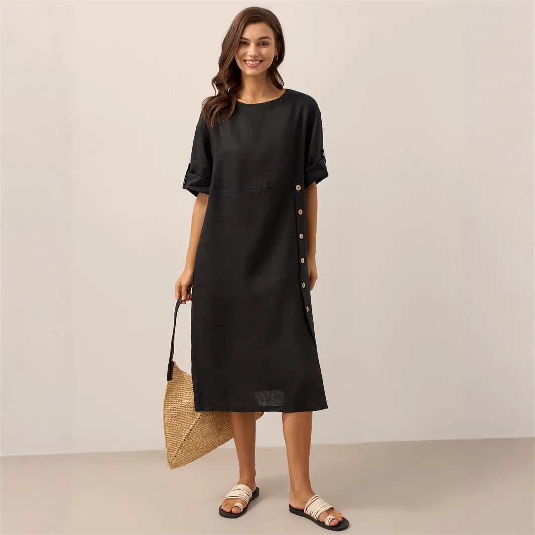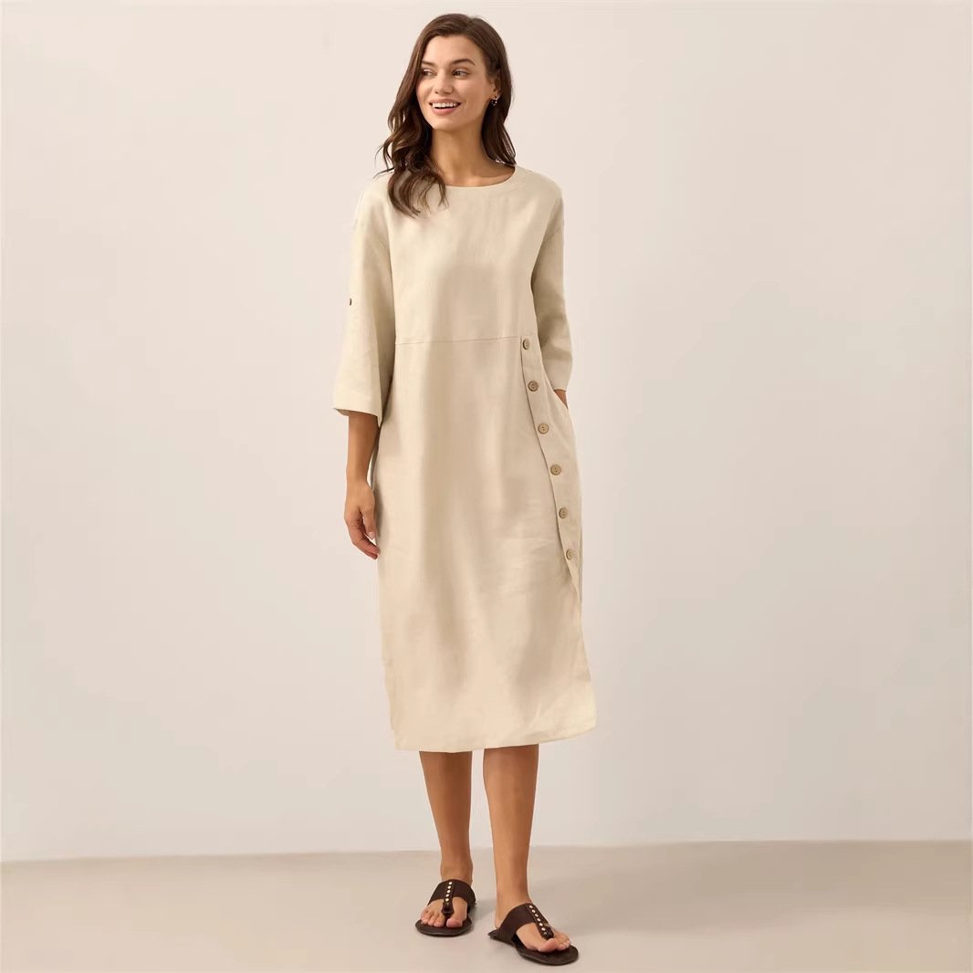 Casual Cotton-Linen Dress With Buttoned Slit And Round NeckCasual Cotton-Linen Dress With Buttoned Slit And Round Neck